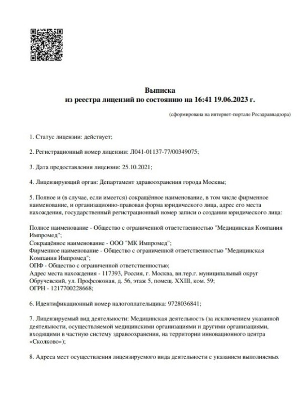 Узнайте расписание врачей в клинике Медицинский центр ИНПРОМЕД м. Новые Черемушки.