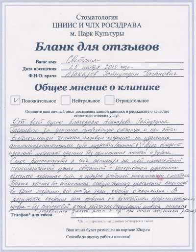 От всей души благодарю Абакарова Зайнутдина Гасановича за успешно проведенную сложную и при этом безболезненную челюстно-лицевую операцию по удалению атипично расположенного зуба мудрости (нижней 8!) Врач обладает идеальной методикой удаления без применения молотка и зубила. Смог расположить к себе несмотря на мой многолетний психологический ужас, связанный с болезненным удалением обычного коренного зуба у хирурга районной поликлиники с молотком. Так же хотелось бы отметить особую технику успокоения пациентов во время операции. В результате операция была проведена на высочайшем профессиональном уровне - без последствий, очень эстетично (аккуратный шовчик, никаких порванных уголков рта и губ при моем маленьком ротике)