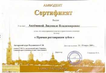 Аксенова Л.В специализируется на проведении терапевтического лечения зубов. Применяет новейшие композитные материалы и техники препарирования для выполнения лечения любой степени сложности. Регулярно проходит обучения связанные с повышением квалификации. Профессионал и эксперт в своем деле. Ищет наилучшее решение для пациента, комплексного подхода, внимательна к деталям.