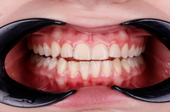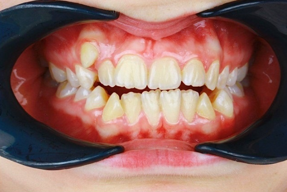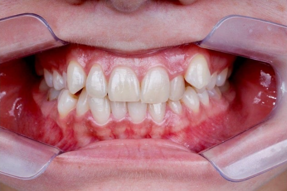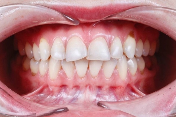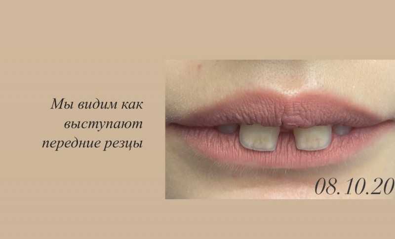 Неправильный прикус. Выраженный дефицит места для зубов, смещение верхней и нижней линий центра челюстей. Суженные зубные ряды.