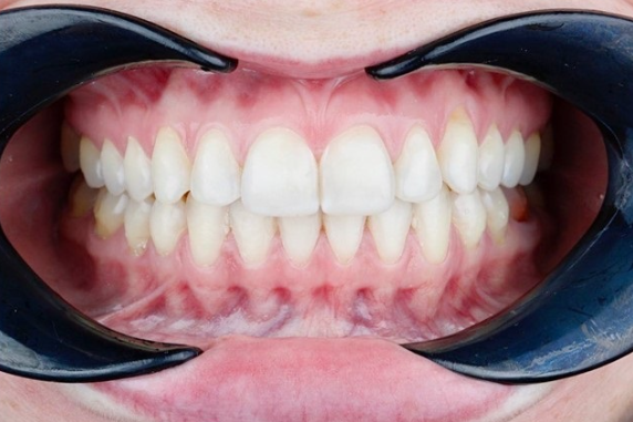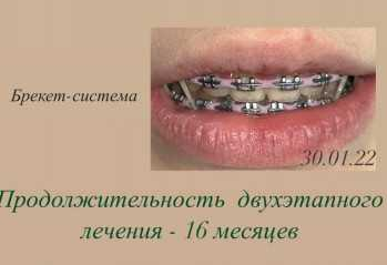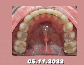 Фиксация брекетов на обе челюсти, ортодонтические накладки, межчелюстные эластические тяги: ношение 24/7. Расширение зубных рядов. Выравнивание зубов. Создание естественной арки улыбки. Увеличение высоты прикуса. Улучшение экспозиции верхних резцов. Эстетические реставрации после снятия брекетов.