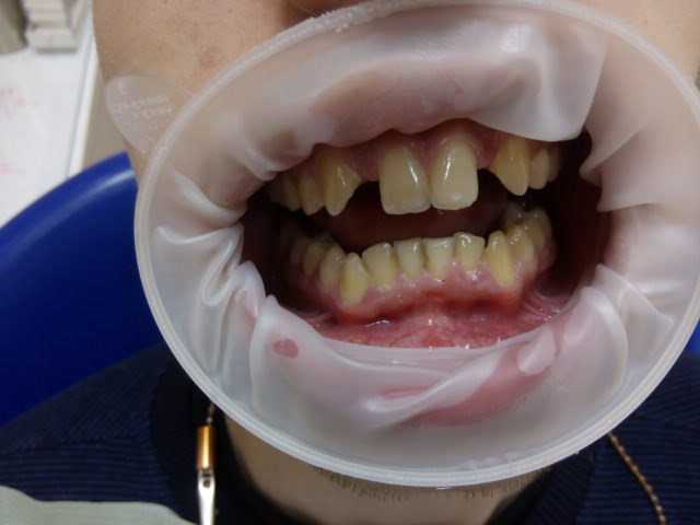 Пациентка обратилась с жалобами на несостоятельность старых коронок на зубах верхней челюсти. К сожалению, не возможно было сохранить ни один из оставшихся зубов, поэтому было установлено одномоментно 4 импланта Nobel Biocare под углом, временный протез на них, а через пол года - постоянный протез, изготовленный в сертифицированной лаборатории Nobel.