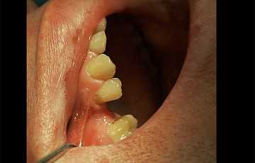 Установили имплант немецкой фирмы Impro с формирователем и провели костную аугментацию (увеличение толщины кости). Равномерная толщина кости по всему зубному ряду.