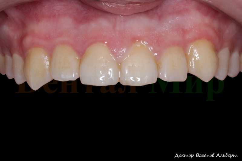 Восстановление формы зубов 1.2, 1.1, 2.1, 2.2 винирами из поливошпатной керамики.