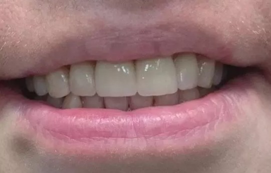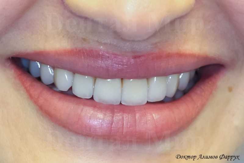 Установлены керамические виниры emax на верхние зубы.