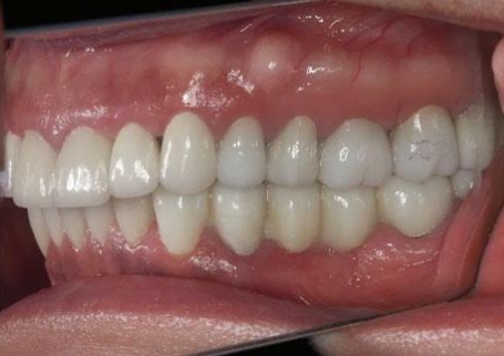 Восстановлена высота прикуса при помощи каппы и постепенным наслоением пластмассы под контролем рентгена. Смоделирована новая форма зубов на диагностических моделях. Проведена минимальная обработка зубов, все зубы остались витальными (живыми). На время изготовления постоянных конструкций зубы были покрыты временными винирами по форме постоянных. Зафиксированы постоянные виниры.