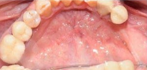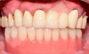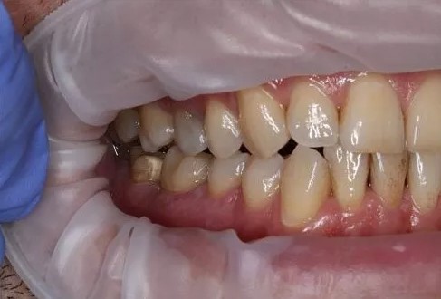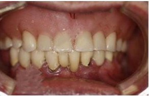 Практически полное отсутствие зубов, атрофия костной ткани, оставшиеся зубы депульпированы и подвижны. Проведено удаление оставшихся зубов, санация полости рта, одномоментная установка имплантов с применением хирургического шаблона. На 3 день установлен несъемный мостовидный протез.