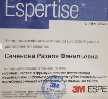 Сеченова Разиля Фанильевна принимает в «СТОМАТОЛОГИЯ СЕЧЕНОВЫХ» в Уфе. Стаж 34 года. Специализируется на терапии, по которой клиника оказывает 16 услуг. Квалификация специалиста подтверждена 8 лицензиями, сертификатами и наградами. Для уточнения дополнительной информации о специалисте или записи на прием можно позвонить по телефону